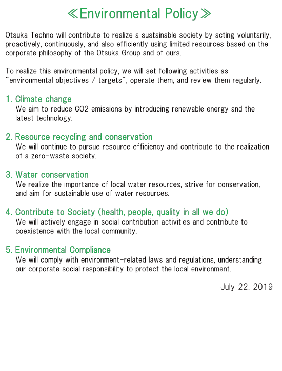 ISO14001 certificate (for Otsuka Holdings Co., Ltd., and for Otsuka Techno Corporation) certified by SGS United Kingdom Ltd.
