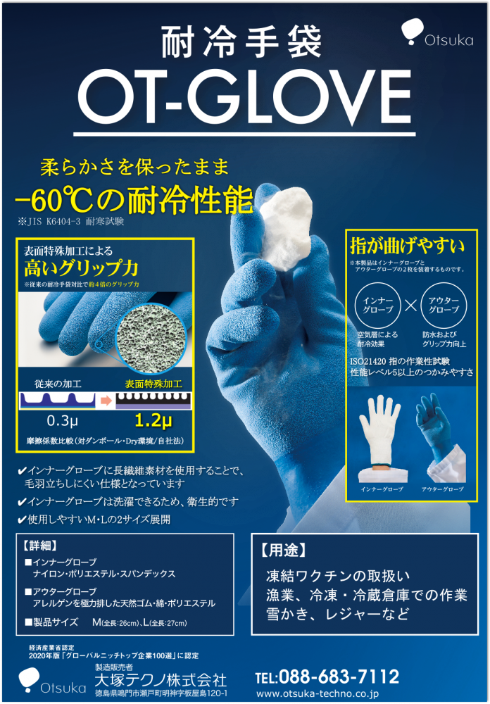 -60℃ cold-resistant gloves while not losing the bendability (*JIS K6404-3 Testing methods for rubber- or plastics-coated fabrics- Part 3 cold-proof)