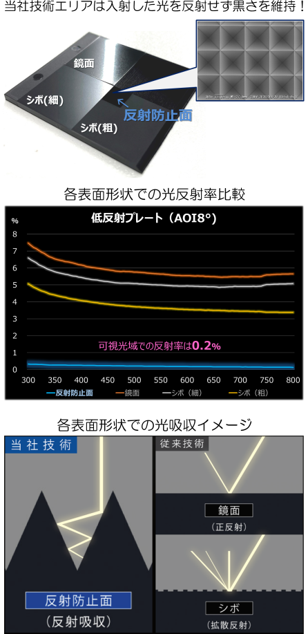 ・Low reflection structure enables to suppress light reflection to the utmost limit and create an devastating black surface only by the molding process.