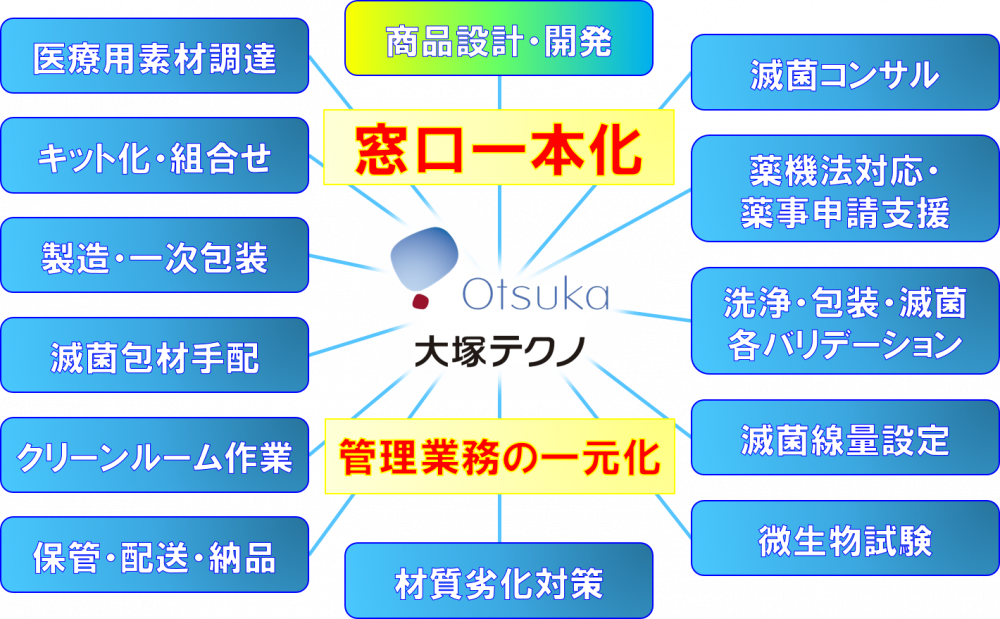・滅菌前の一次包装から滅菌業者様への依頼、配送、保管、最終ユーザーへの納品、付帯管理業務のワンストップ化、最適化
