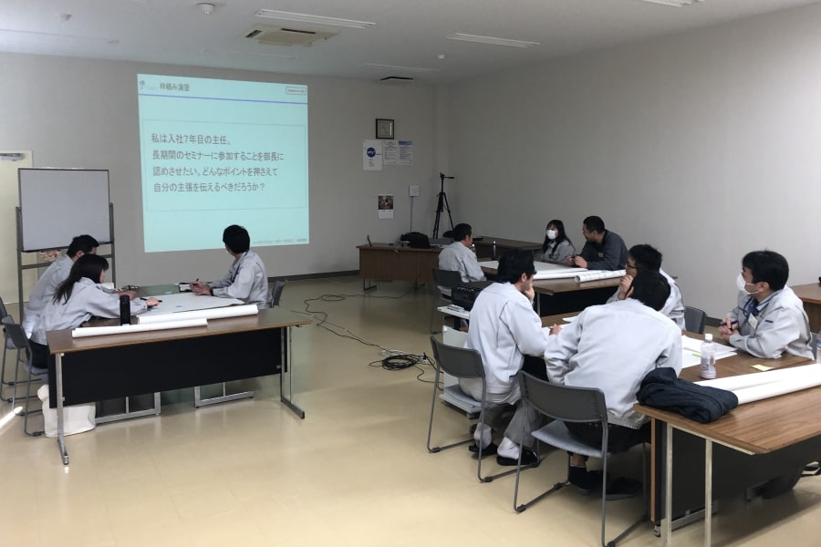 中堅社員研修は、係長職候補者を選抜し、リーダーとしてのマインドセットを学び、行動変容(アウトプット)していくためのカリキュラムを実施しています。求められる役割への理解を深め、チームでのワークショップを通じ、自己の成長と組織として成果を出すために必要なコミュニケーションやロジカルシンキングの習得を進めています。